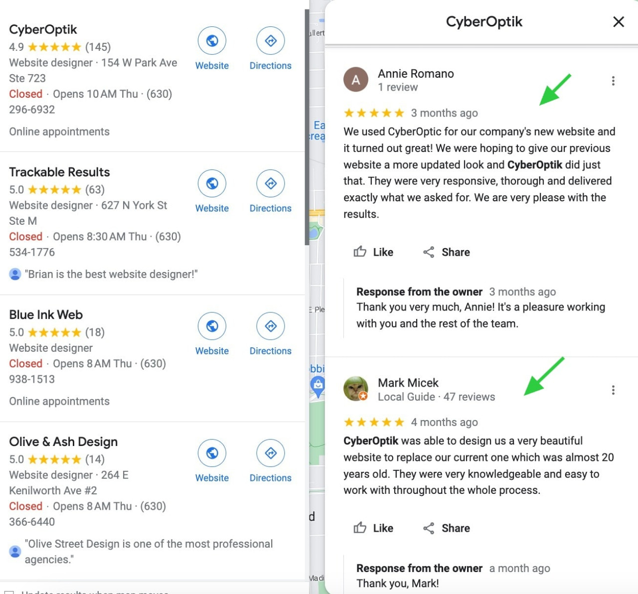 Local businesses listed on the map have star ratings next to their name. Google wants to offer an enhanced user experience and help them to find the best nearby business. Most users refer to online reviews before they trust a local business for its services or products. Reviews can highly influence the purchase process for any business.