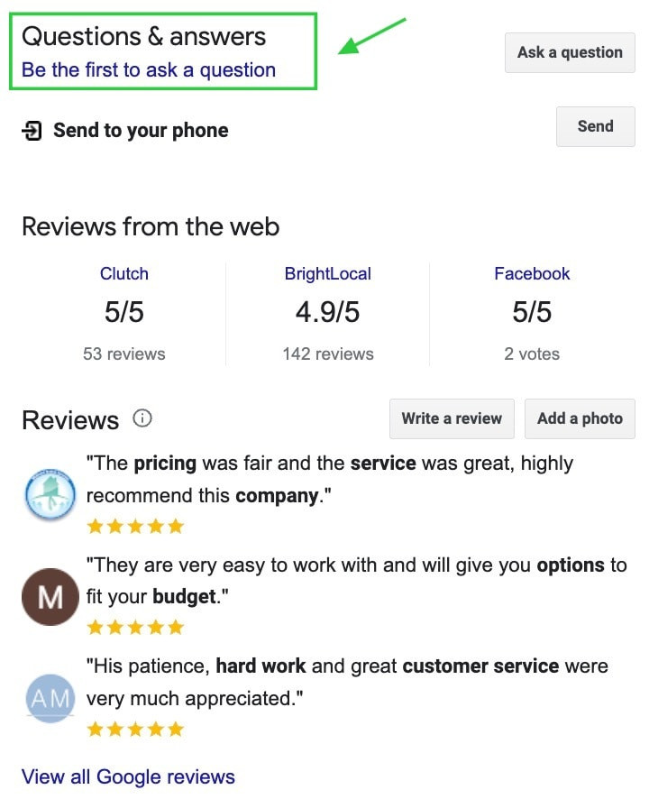 Build up a good database on Google Q&AGoogle's Q&A feature allows customers to ask about your local business. The primary purpose of this feature is to provide users with additional information about the business. It is also a great way to gain extra local exposure. As a business owner, it is helpful for you to create a database of relevant and useful information to help users consider your business for their search terms.